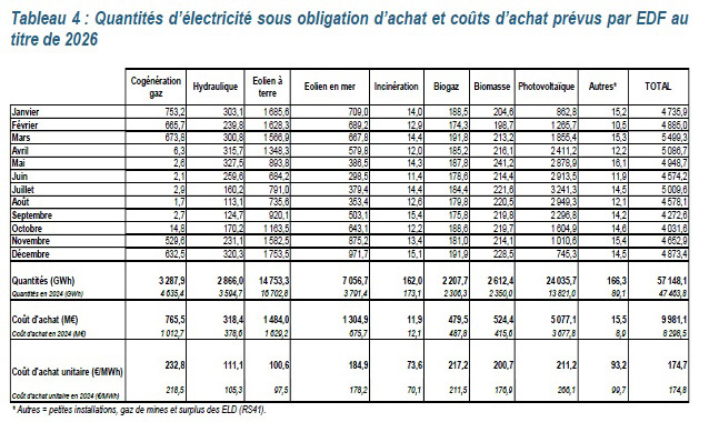 | Le poids de ces surcoûts des EnRi est largement dénoncé depuis des années, notamment par l’Agence internationale de l’énergie (AIE) qui préconisait en 2020 le recours au VALCOE (Value-adjusted LCOE) pour les prendre en compte.La nouveauté n’est que dans l’initiative de l’UNCE d’alerter sur les promesses biaisées par le seul LCOE des énergies renouvelables.Les prix garantisEn France, le soutien aux énergies renouvelable a pris la forme d’un tarif obligatoire d’achat jusqu’en 2017, progressivement remplacés par des contrats de rémunération conclus sur la base d’appels d’offres. Les tarifs d’achat obligatoires et leurs quantités sont récapitulés, ci-dessous dans l’annexe 1 de la délibération de juillet 2025 de la CRE. |