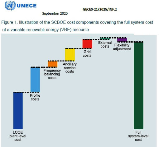 | Par Jean Pierre Riou.Ingénieur de formation et expert indépendant du système électrique français. Il travaille depuis de nombreuses années sur l’économie de l’électricité, le fonctionnement du parc nucléaire et les impacts des politiques de développement des énergies renouvelables intermittentes. Il est régulièrement auditionné par des commissions parlementaires sur ces sujets. Le caractère intrinsèquement variable des énergies renouvelables électriques dites « intermittentes » (EnRi) fausse la comparaison de leurs coûts de production avec ceux des énergies conventionnelles dites « pilotables ». Ce qui biaise du même coup toute programmations de l’énergie. L’objet de cet article est d’éclairer un tour d’horizon de ces surcoûts, qui s’avèrent plus ou moins cachés.Les coûts cachés« The United Nations Economic Commission for Europe » (UNCE) est une émanation régionale des Nations Unies, établie en 1947 pour encourager la coopération économique des États membres.En septembre 2025, l’UNCE a publié un rapport mettant en garde sur l’insuffisance du LCOE (Levelized Cost of Electricity) pour comparer les prix de production d’électricité. Ses carences risquant de fausser les politiques énergétiques. Les productions d’électricité intermittentes ou « variables » sont ciblées par cette insuffisance qui occulte les coûts qu’elles induisent sur le système électrique. Le rapport détaille ces coûts hors LCOE qu’il illustre sur la figure reproduite ci-dessous. |