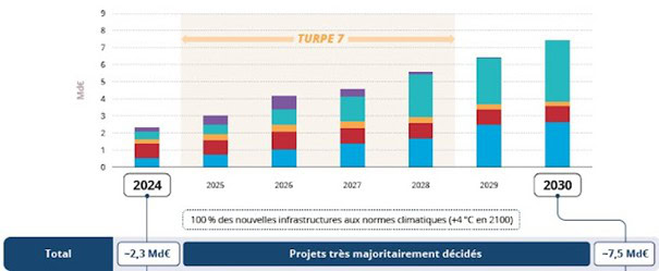 Selon RTE, le montant des besoins d’investissement estimés pour 2030 est de 7,5 Md€, contre 2,3 Mds € en 2024, soit un triplement entre 2024 et 2030.