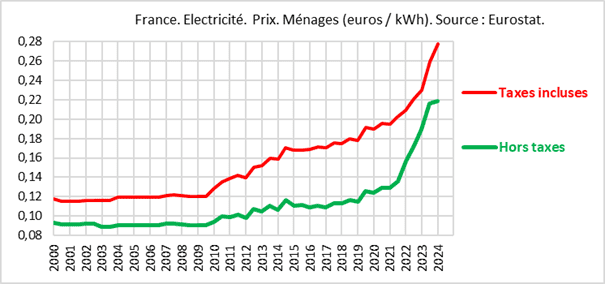 Par ailleurs, les mêmes données Eurostat montrent que le prix TTC de l’électricité est passé de 0,1207 €/kWh de fin 2009 à 0,2926 €/kWh à fin 2024, soit une augmentation de 142% en 15 ans. Ramenée en euros constants, cette hausse, reste de l’ordre de 91%.
